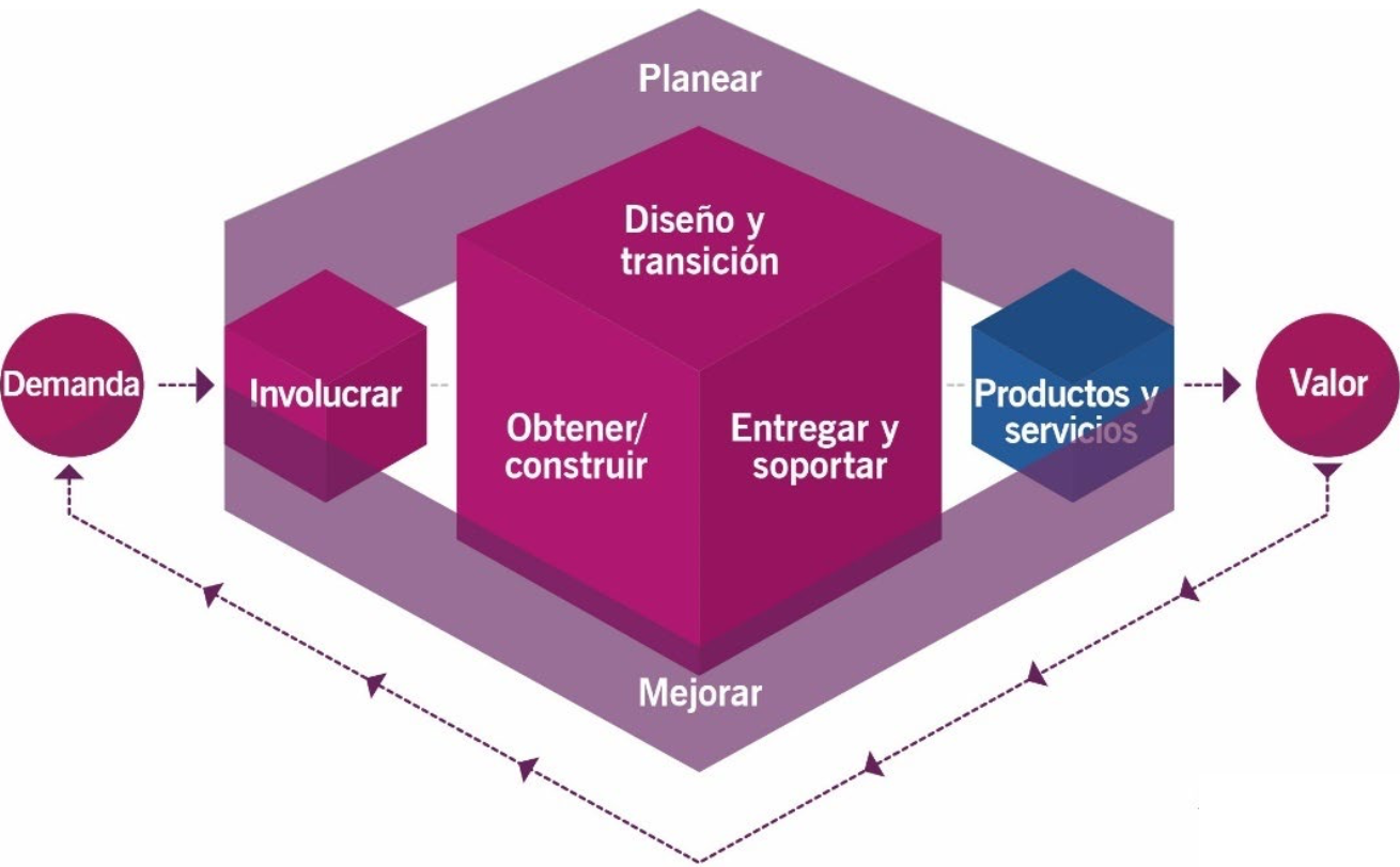 En ITIL, el elemento central es la "Cadena de Valor del Servicio", el cuál es un modelo de operación con actividades clave necesarias para responder a la demanda, entregar valor mediante la creación y gestión de productos y servicios.